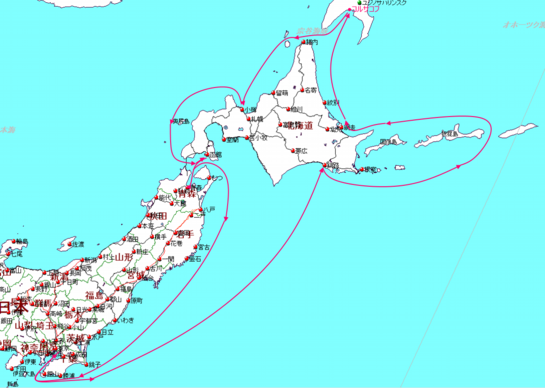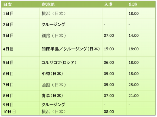 今回のクルーズは横浜発着で釧路、知床半島、コルサコフ、小樽、函館、青森を巡ります。