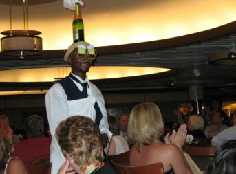 ホールスタッフのクルーは料理を運ぶだけでなくエンターテイナーでもあり、日本人には片言ですが日本語で