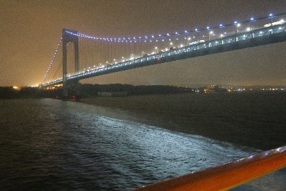 肌寒い、いまだ夜が明けやらぬ雨の降るニューヨーク港入口のベルサノブリッジを午前5時半にくぐっては入って行きます。