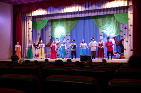 市民ホールでショッピング(円でも、ドルでも、支払いOK)後、隣の会場でロシア民謡の踊りと歌を観劇、