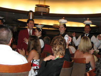 ホールスタッフのクルーは料理を運ぶだけでなくエンターテイナーでもあり、日本人には片言ですが日本語で