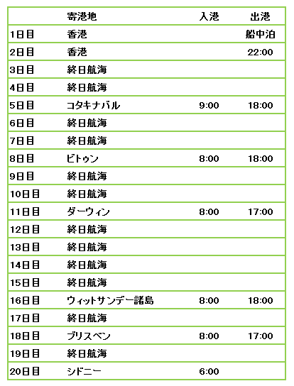 今回のクルーズは香港発シドニー着で、世界一周クルーズの区間乗船となっています。