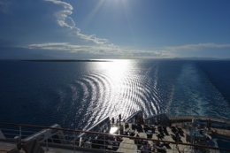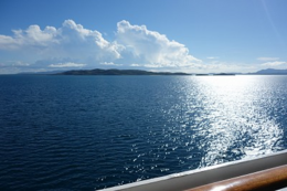 BGMが流れる中、窓から右手にはオーストラリアの陸地、右手は天気が良くキラキラと輝く水面を眺めていると本当に安らぎ幸せな気分になる。
