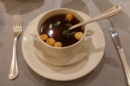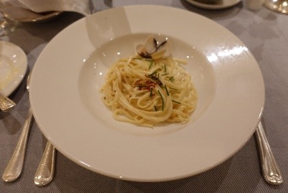 あさりのパスタ、ダブルコンソメスープ、ステーキです