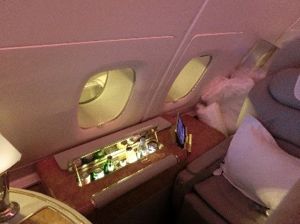 ファーストクラスキャビンの様子(お料理やシャワールーム)