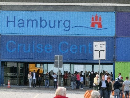 9時過ぎに上陸。接岸したハンブルグクルーズセンターは驚いたことに40フットコンテナーで構成された簡素なものです。でもQM2が大西洋横断クルーズ時に3度に1度は訪れているからかQM2に関係した表示が多いのは良かったですね。