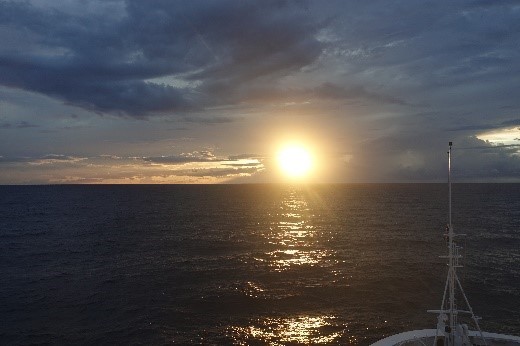 昨日と同じような天気。でも波がより高くて時々ドスン、ドスンと振動が伝わってきます。船首には虹がかかってきれいです。でもその後スコールが来て前が何も見えなくなりました。で、最後には写真のような幻想的なサンセットを迎えました。