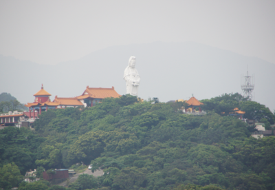 港を進んでいくと、左手に小高い山の上から観音像が出迎えてくれます。