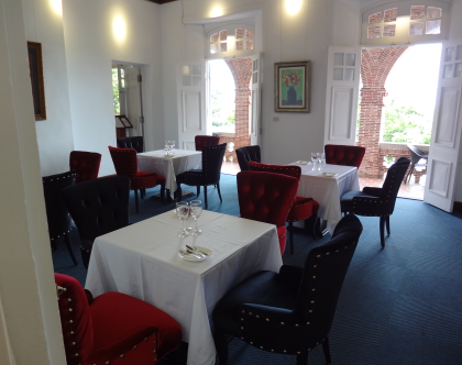建物内のレストランの外側にあるテーブルです。お天気の日にカフェを楽しむなら
