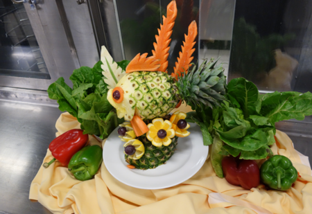 野菜や果物をつかった花や動物のアレンジメントがたくさん準備されていて綺麗でした。