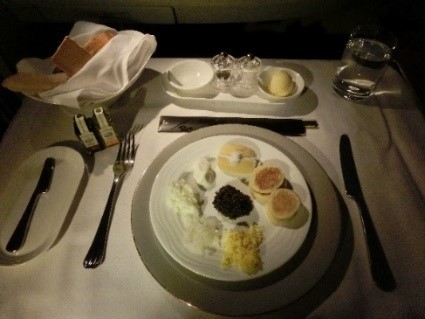 食事前は日本の映画を見ながら、キャビアセットとバージンモヒートを楽しみます。