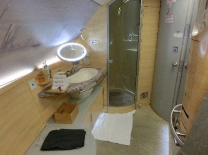 ファーストクラスキャビンの様子(お料理やシャワールーム)